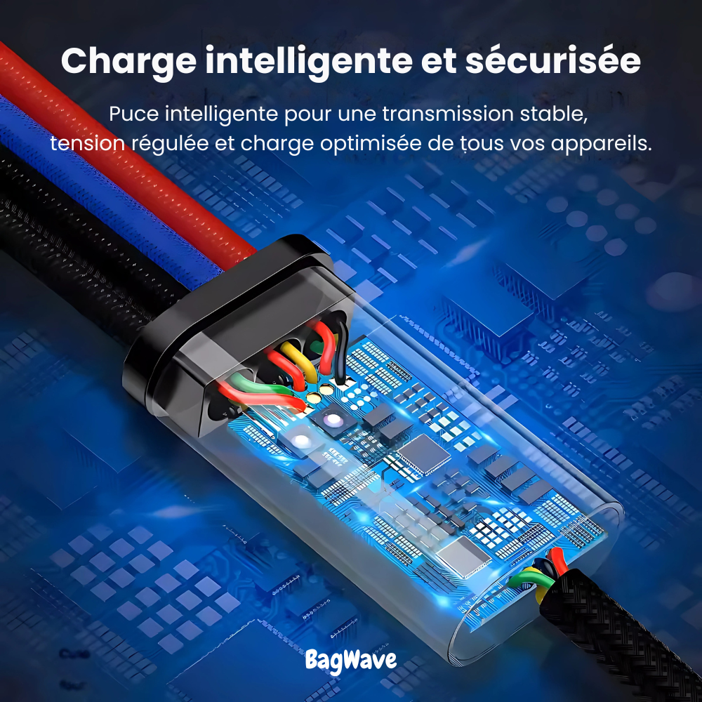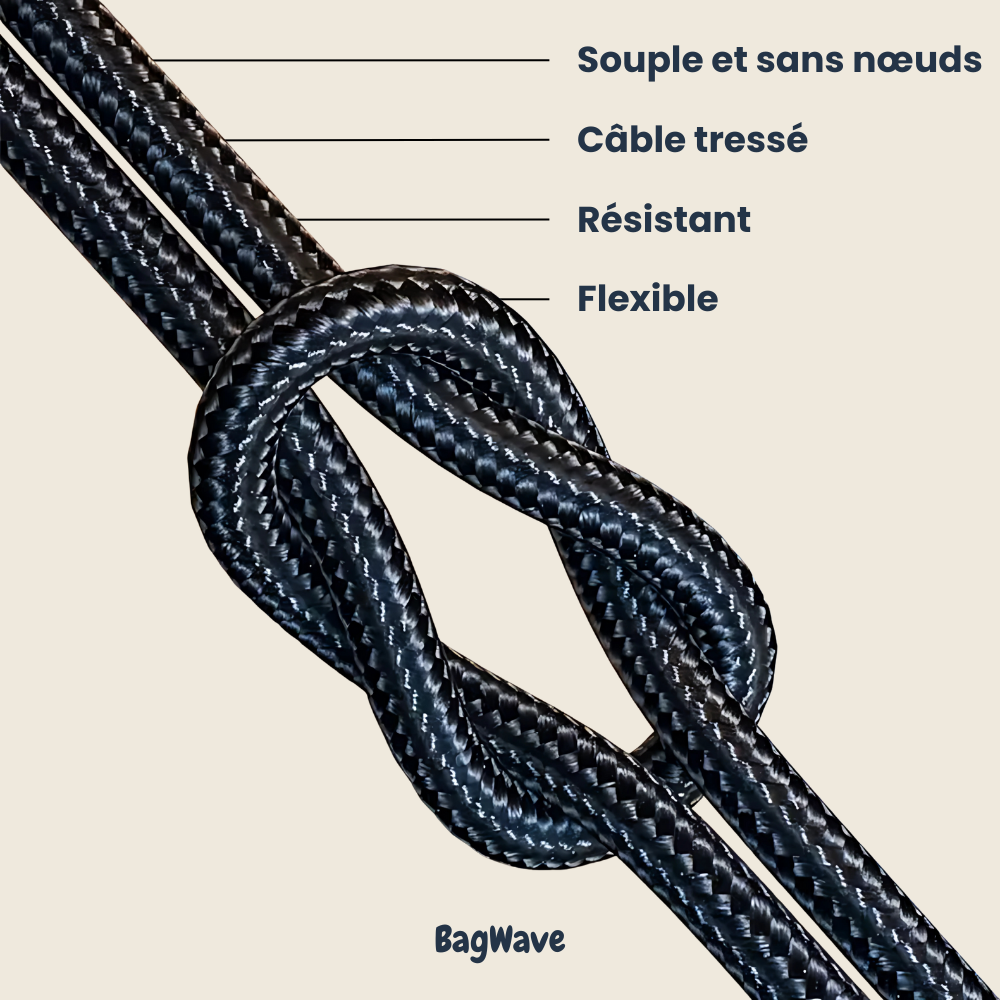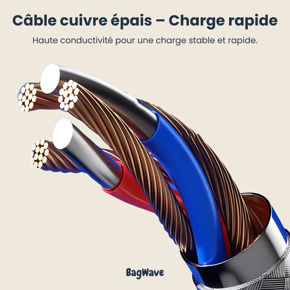 Très pratique, il charge tous mes appareils avec un seul câble. Le tressage est solide et il ne s’emmêle pas.