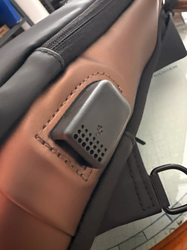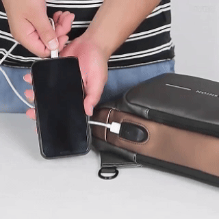 Le port USB externe est protégé par un revêtement rigide. Il se relie simplement à une batterie externe (non incluse) placée à l’intérieur du sac, ce qui vous permet de recharger vos appareils sans ouvrir le sac.